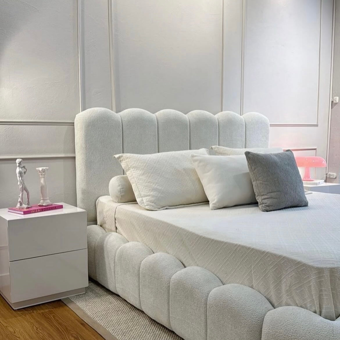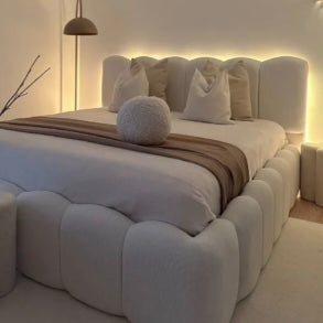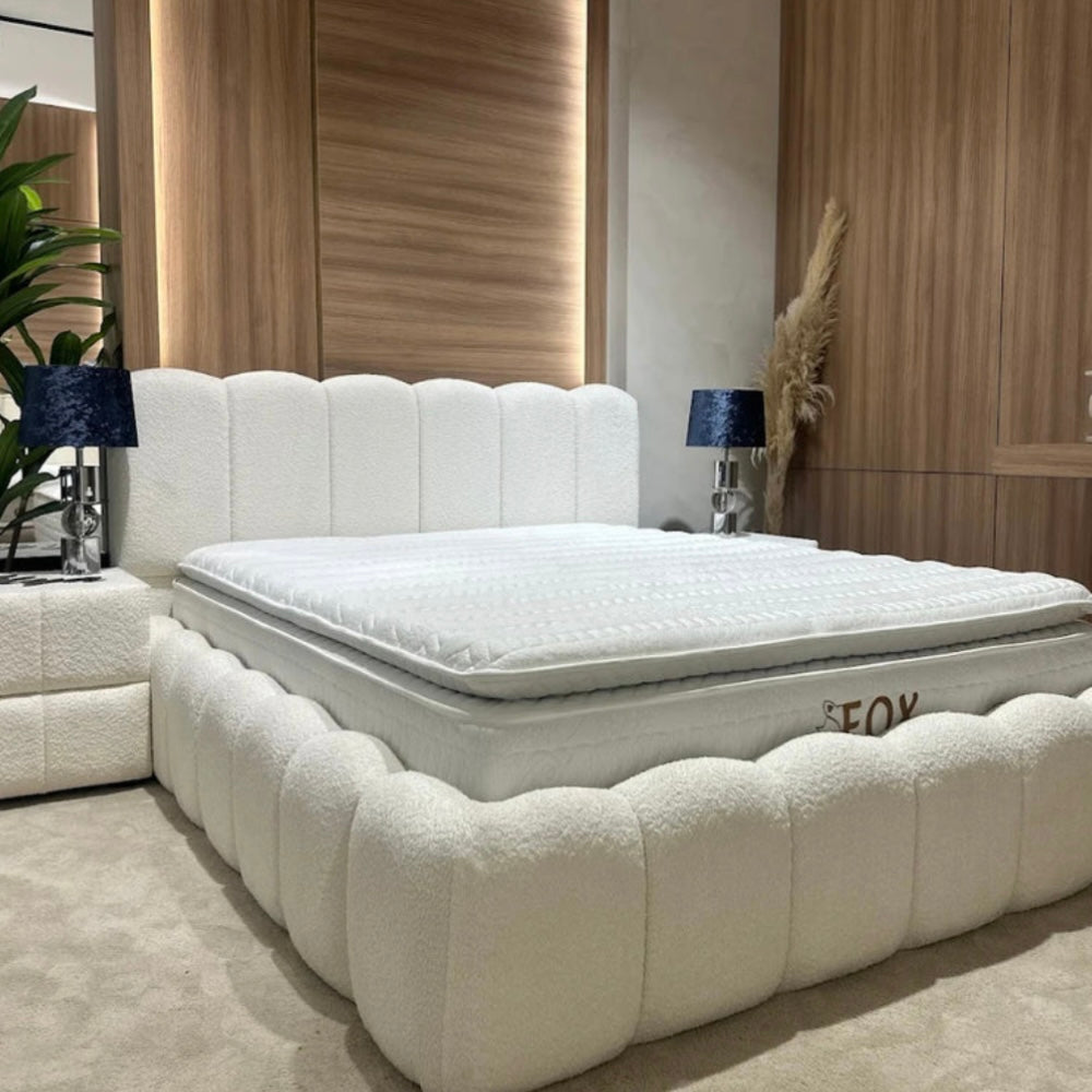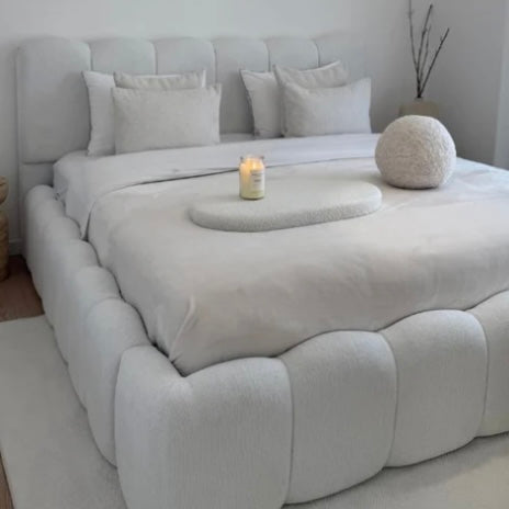 Le lit coffre Alya en tissu bouclé blanc est une pièce maîtresse pour votre chambre à coucher.
